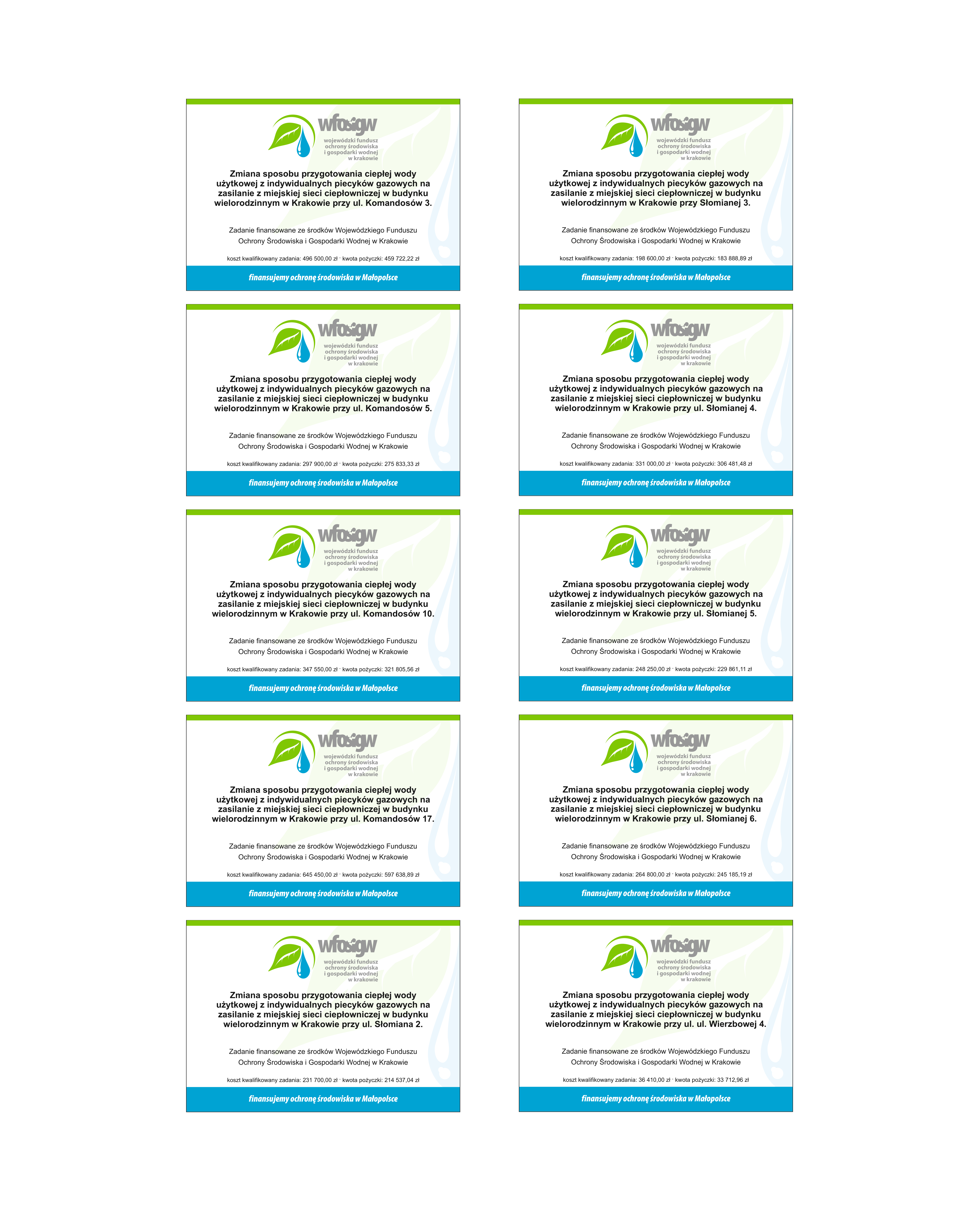 Zarząd SM Podwawelska ma przyjemność poinformować Państwa, że obecnie finalizujemy drugi etap realizacji ,,Programu zmiana sposobu przygotowania ciepłej wody użytkowej z indywidualnych piecyków gazowych na zasilanie z miejskiej sieci ciepłowniczej’’   na osiedlu Podwawelskim – w roku 2024 udało nam się wykonać instalacje CWU w 10 budynkach. Dzięki podjętej przez Walne Zgromadzenie uchwale udało nam się  pozyskać wsparcie finansowe z Wojewódzkiego Funduszu Ochrony Środowiska i Gospodarki Wodnej w Krakowie w postaci niskooprocentowanej pożyczki celowej (która może zostać w części umorzona), co umożliwiło nam przyspieszenie prac i wykonanie instalacji CWU w tak dużej ilości obiektów w jednym roku, co jest osiągnięciem bezprecedensowym. Poniższe foldery informują o wysokości środków finansowych pozyskanych z WFOŚ i GW w Krakowie.